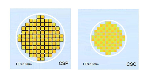 比喻形象,還需數(shù)據(jù)佐證。在采用相同尺寸晶片、功率(數(shù)量)相同的前提下,我們來(lái)看看CSP與CSC實(shí)際應(yīng)用的區(qū)別。