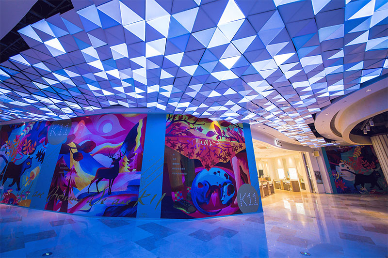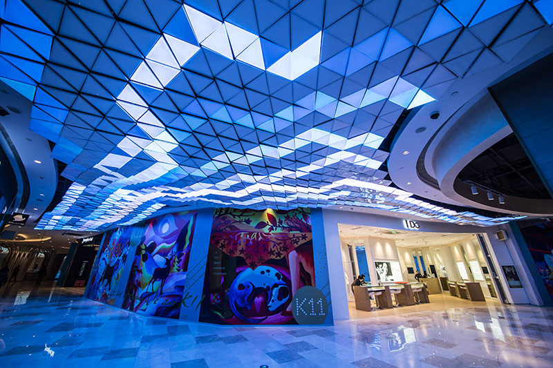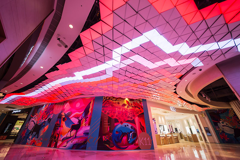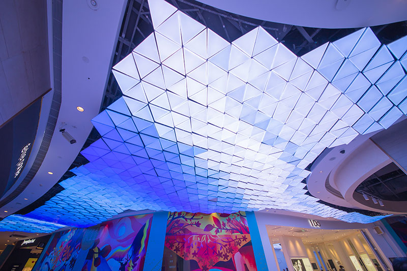 整個藝術作品是由1,500 塊等大的三角形燈片構成,每個燈片的傾斜角度及離地高度不同,3 米寬、31 米長如海浪般的曲線造型懸掛在天花板上。流動的波浪中安裝著可以變換1,680 萬種顏色和圖案的LED 燈光設備,所有顏色的變化與效果可通過計算機程序控制,通過改變每一個燈片的顏色組成各種形態(tài)。