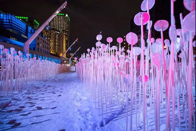 該項(xiàng)目的設(shè)計(jì)是從魁北克的麥田里得到靈感的,當(dāng)小麥迎著微風(fēng)左右擺動(dòng)時(shí),景色尤其美麗。由麥田浮動(dòng)而生的Entre les rangs裝置是由成千個(gè)靈活柔韌的莖管組成,管狀結(jié)構(gòu)頂部附有一個(gè)白色的反光膜,這些反光膜利用周圍的景觀刺激可以不斷移動(dòng)變換,充滿活力與動(dòng)感。