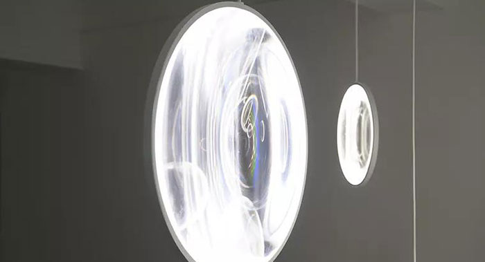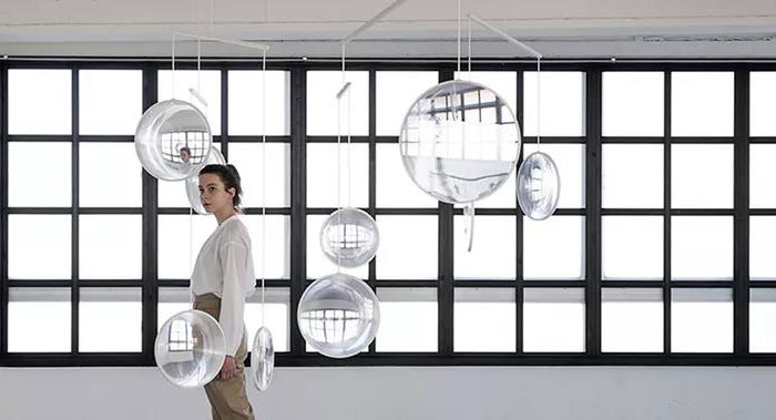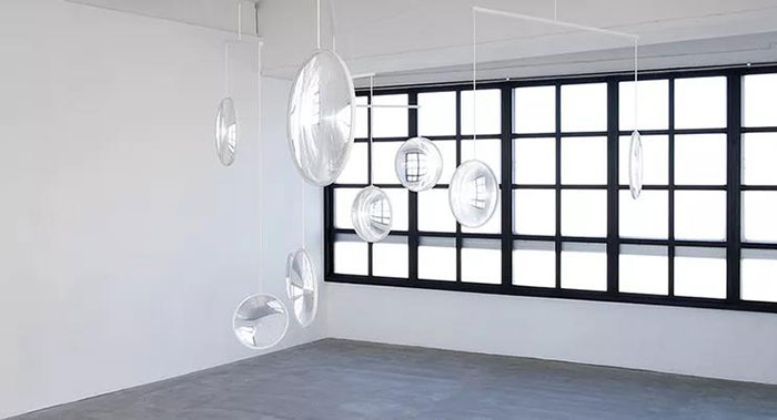 “focus”是一個(gè)多方向的空間裝置,它以不同角度朝向周圍環(huán)境,創(chuàng)造出一種持續(xù)變化的感知空間。一系列扁平而輕質(zhì)的透鏡被懸掛于屋頂,全方位地捕捉、收集并散射著來(lái)自窗外和室內(nèi)的光線。與此同時(shí),這些鏡面還反映出四面八方的風(fēng)景,創(chuàng)造出一系列嵌入“光圈”中的浮動(dòng)世界。