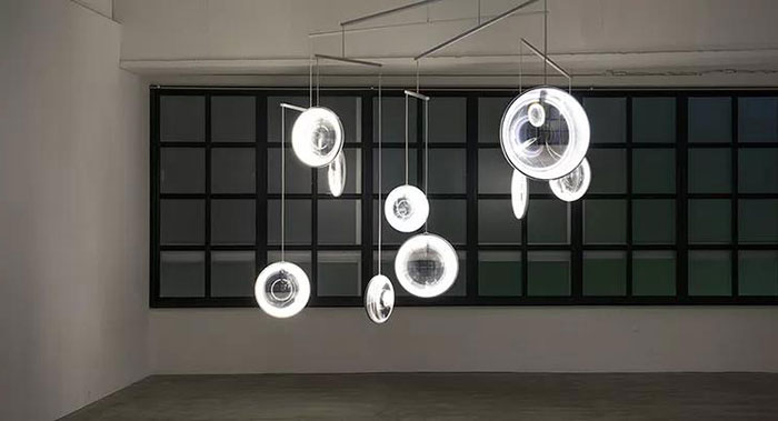 在重力的微妙作用下,裝置隨著周圍的氣流變化發(fā)生輕微的搖擺和轉(zhuǎn)動(dòng),呈現(xiàn)出多樣化的姿態(tài)。當(dāng)夜幕降臨或者背景光過(guò)于微弱時(shí),鑲嵌在鏡面邊緣的照明設(shè)備將點(diǎn)亮框中的場(chǎng)景,由此產(chǎn)生的燈光效果將使觀察者的目光集中在鏡面之外的另一個(gè)世界。