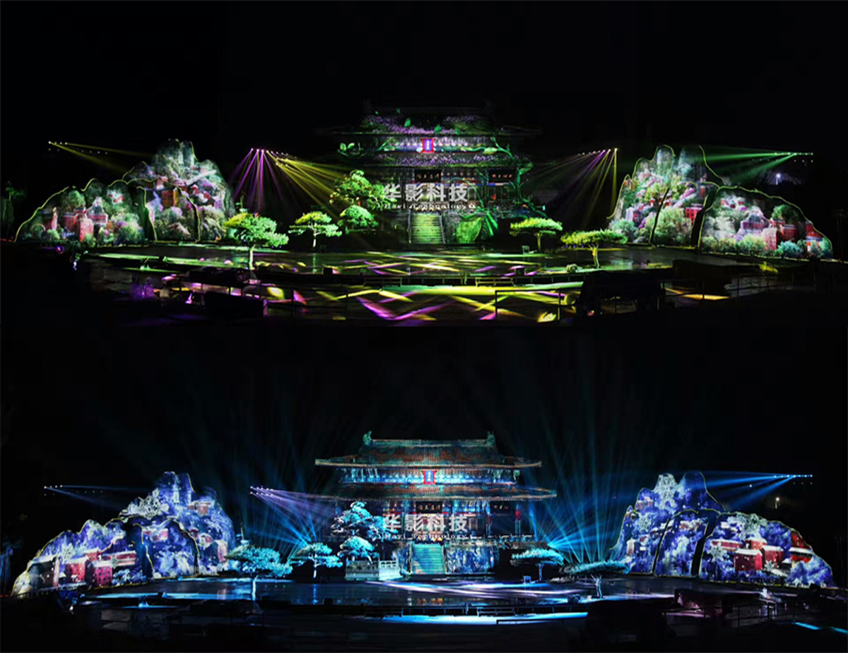 12臺(tái)20000流明投影燈、12臺(tái)8500流明投影燈、2臺(tái)16000流明投影燈融合方式投射。