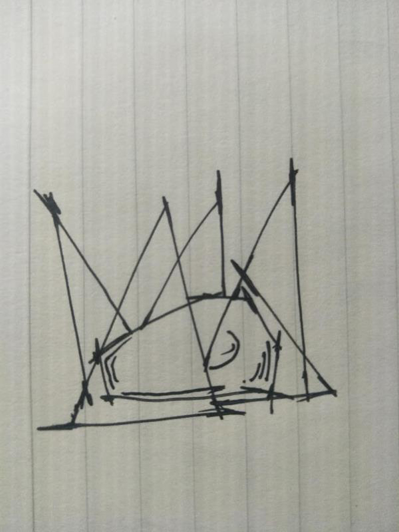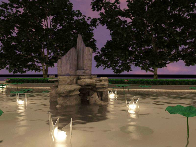 本次設(shè)計(jì)靈感源出于假山碎石掉入池中水平面濺起的一瞬間畫面。 將飛馳的水珠幾何化簡為角形,意欲營造冬季結(jié)冰時的形狀。荷花則迎夏,與之呼應(yīng),將本不該同時出現(xiàn)的兩種情景通過一靜一動相結(jié)合。