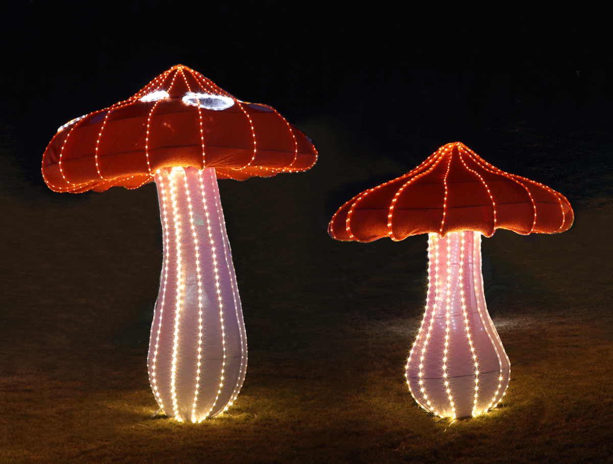 該產(chǎn)品是經(jīng)過藝術(shù)加工提煉的蘑菇造型,采用高亮度LED燈體及特殊透光布料制作而成,防水性好,亮度高、耗電量低,節(jié)能環(huán)保。廣泛應(yīng)用于各種燈光節(jié)、公園、商業(yè)廣場、主題樂園等場所作為景觀造型裝飾燈飾。