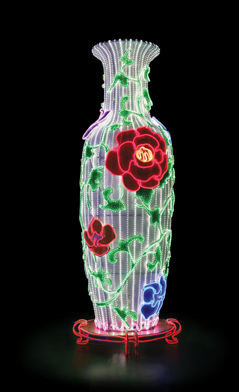 該產(chǎn)品取材于中國(guó)傳統(tǒng)瓷器大花瓶,寓意為吉祥平安,具備濃厚的中國(guó)傳統(tǒng)文化氣息。產(chǎn)品采用高亮度LED燈體及特殊透光布料制作而成,防水性好,亮度高、耗電量低,節(jié)能環(huán)保。廣泛應(yīng)用于各種燈光節(jié)、公園、商業(yè)廣場(chǎng)、酒店大堂等場(chǎng)所作為景觀造型裝飾燈飾。