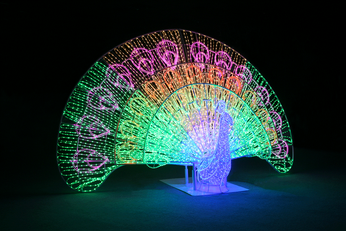 孔雀被人們視為“百鳥(niǎo)之王”,是最美麗的觀賞鳥(niǎo),是吉祥、善良、美麗、華貴的象征。該產(chǎn)品采用高亮度彩色LED燈體制作而成,很好地突顯了孔雀開(kāi)屏絢麗多彩的特點(diǎn)。產(chǎn)品防水性好,亮度高、耗電量低,節(jié)能環(huán)保。廣泛應(yīng)用于各種燈光節(jié)、公園、商業(yè)廣場(chǎng)、酒店大堂等場(chǎng)所作為景觀造型裝飾燈飾。